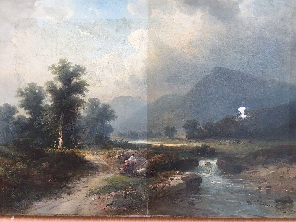In this river scene, while cleaning, we found a fisherman who had been painted over, so we brought him back. #🎣 #thecollector #thecollectorantiques #antiques #artrestoration #restoration #oil #oilpainting #artwork #conservation #artconservaion #fineart #fineartrestoration #easelpainting #therepairshop #antiquesshop