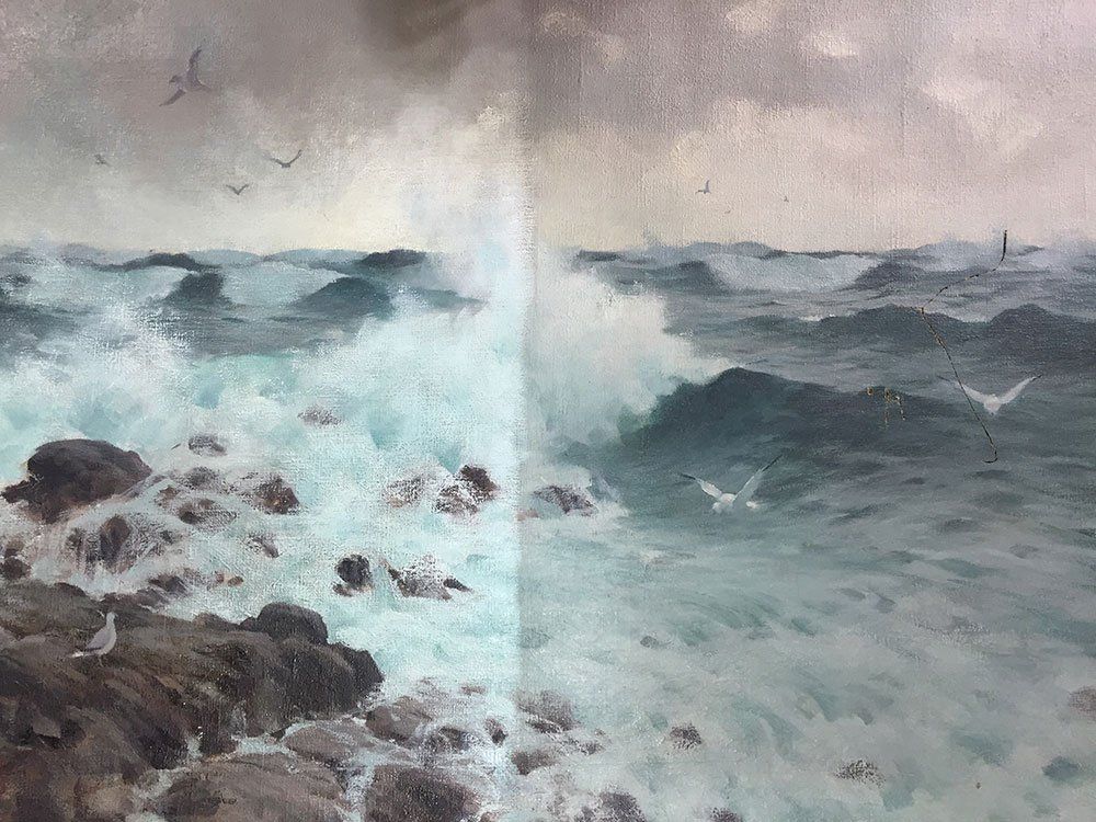 Before/Half-way/After images of a seascape of Whitby coastline #seascapepainting #seascape #thecollector #thecollectorantiques #antiques #artrestoration #restoration #oil #oilpainting #artwork #conservation #artconservaion #fineart #fineartrestoration #easelpainting #therepairshop #antiquesshop #furniture #furniturerestoration