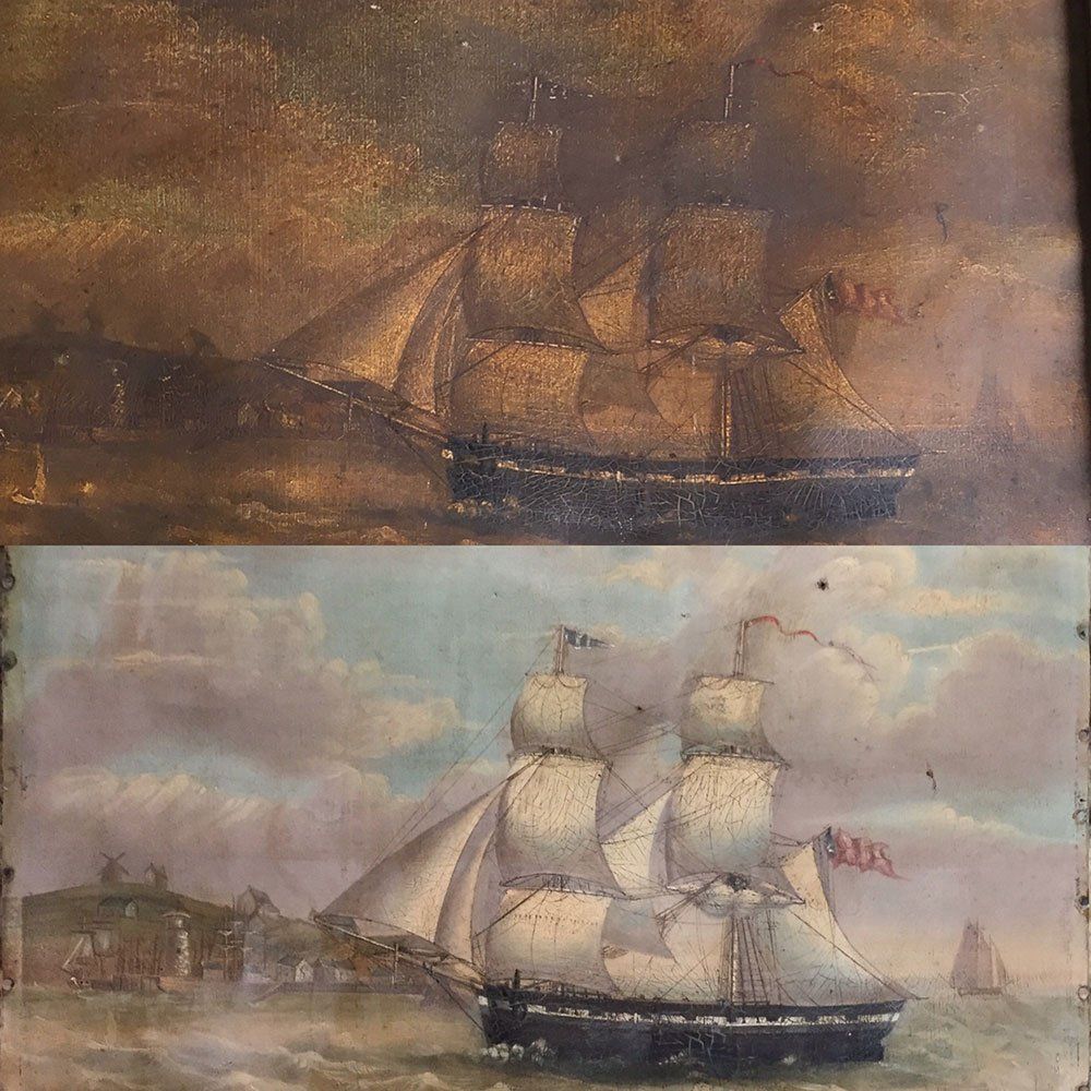 Cleaning a painting of a harbour scene possibly Bridlington. Circle of Nicholas Condy (1793-1857) now #forsale. #thecollector #thecollectorantiques #antiques #artrestoration #restoration #oil #oilpainting #artwork #conservation #artconservaion #fineart #fineartrestoration #easelpainting #therepairshop #antiquesshop #artrestoration