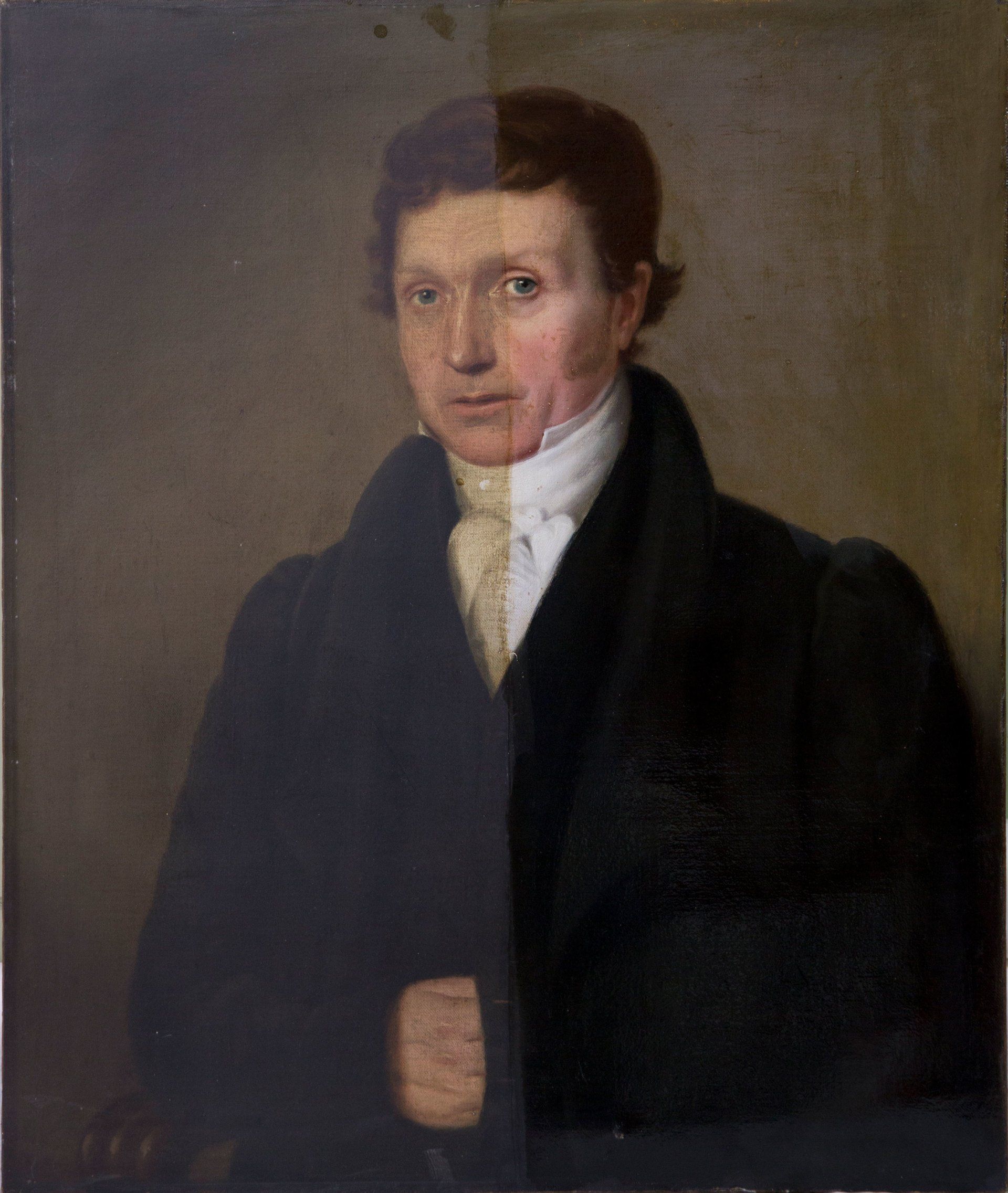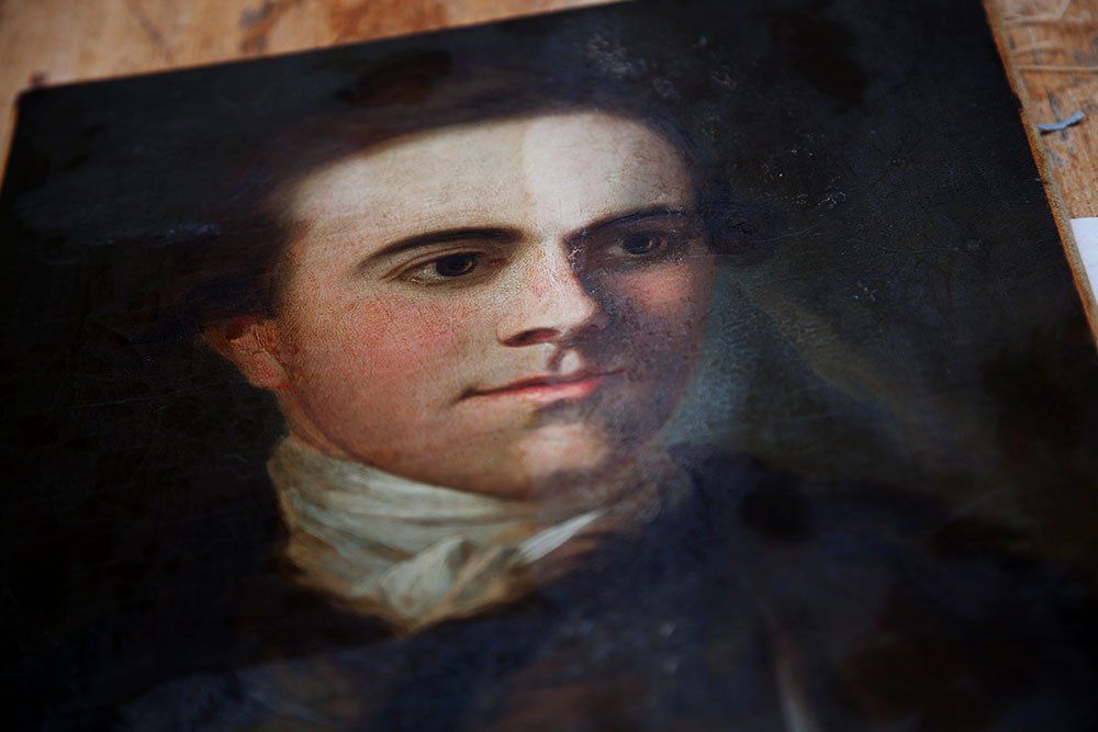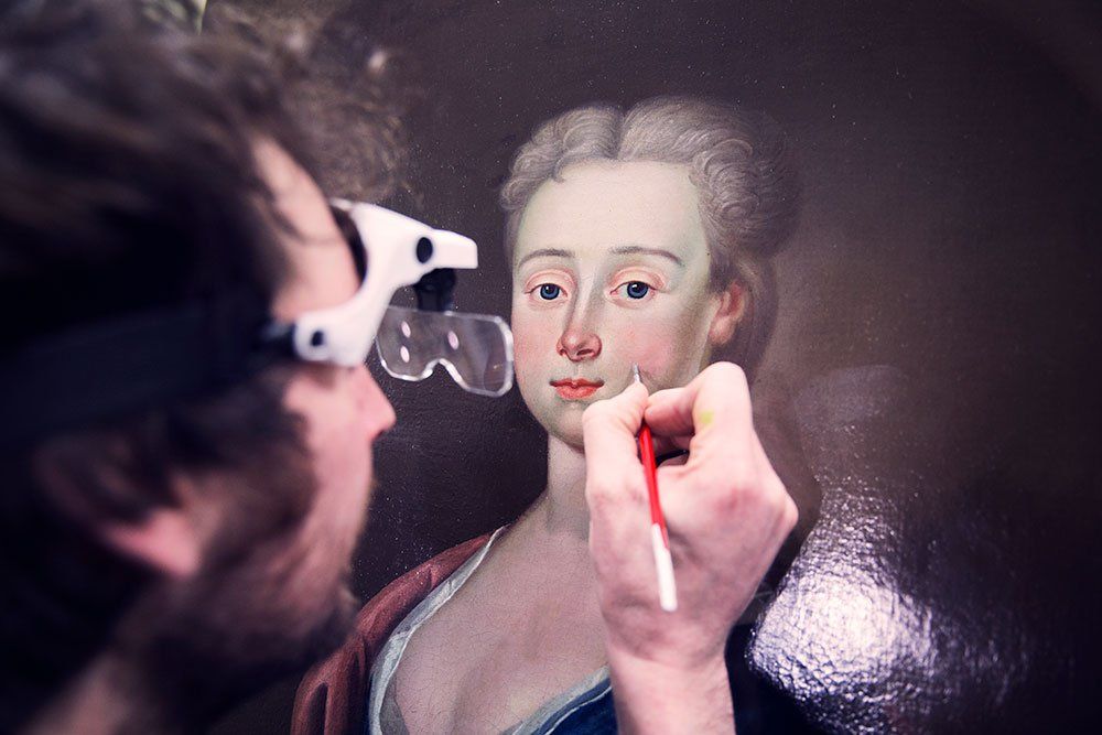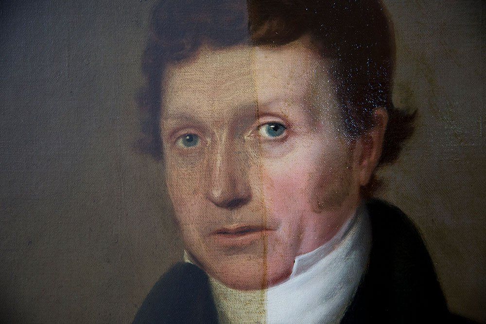 Removing yellowed varnish from a portrait of a boy.